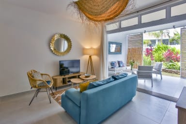 The lounge/kitchen area opens onto a lovely 20 m2 terrace with a pretty garden and easy access to the pool and beach.