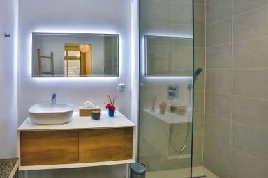 As soon as you enter, you will find the bedroom on your right, which has its own bathroom with a shower, as well as a very comfortable queen sized hotel quality bed. The toilets are separate.