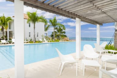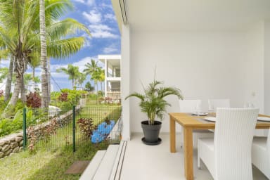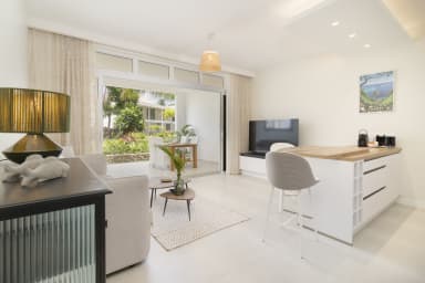 Le salon confortable et la cuisine équipée s'ouvrent sur une magnifique terrasse donnant sur un jardin tropical. Profitez de cet environnement paisible et haut de gamme tout en vous relaxant sur le canapé, bercé par une douce brise.